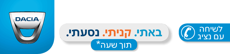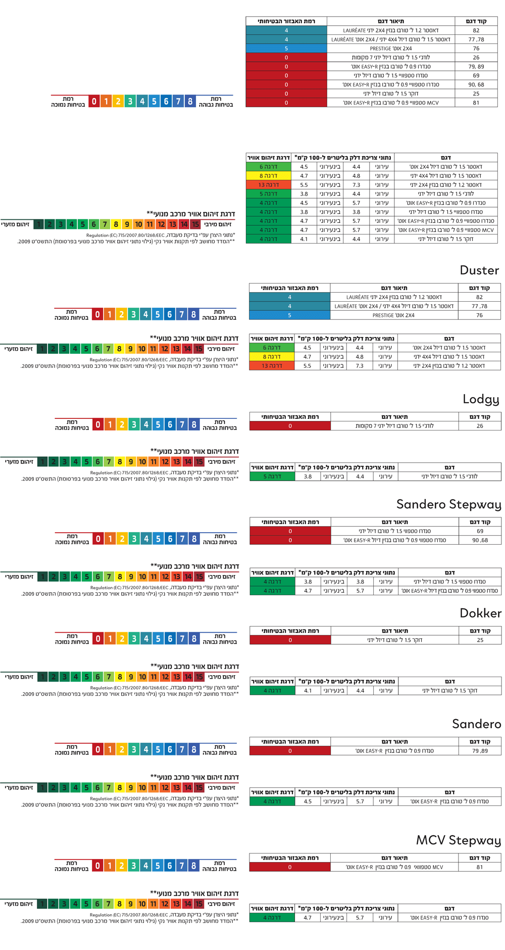 *לפי מחירון 2019001 לא כולל אגרת רישוי. התמונה להמחשה בלבד. נתוני צריכת הדלק שלהלן הם לפי בדיקות מעבדה. צריכת הדלק בפועל עשוייה להיות שונה משמעותית הואיל והיא מושפעת מאופי הנהיגה, השימוש ברכב, תנאי הדרך ומגורמים נוספים. דגם דאסטר מתייחס לדגם טורבו בנזין 1.2 ליטר ידני.